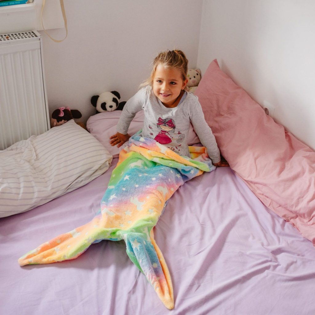 • The product features a mermaid-tail or mermaid-tail-blanket motif combined with a galaxy / star-night theme.